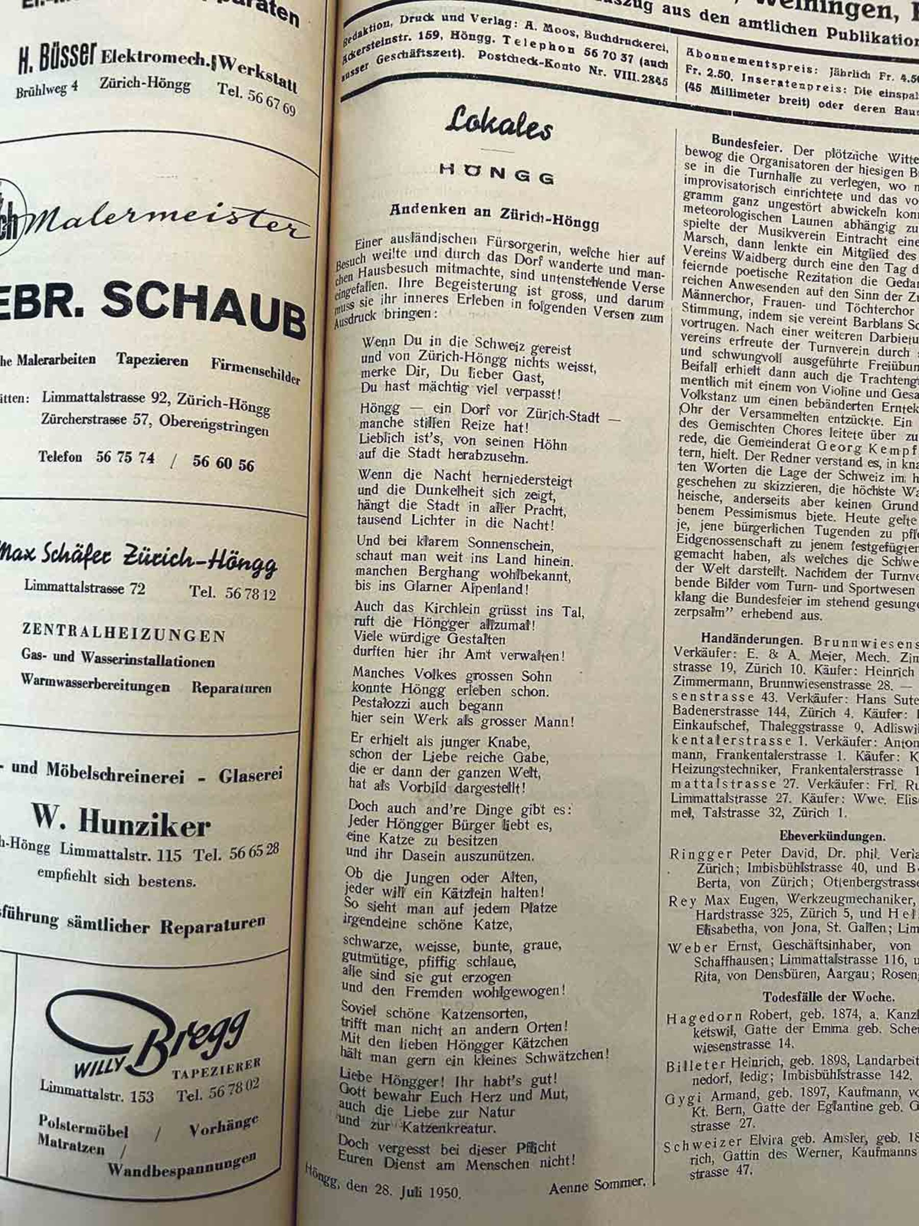 Auch die Bundesfeier auf dem Hönggerberg wurde redaktionell viel beachtet. Im August 1946 wurde auf der Titelseite die gesamte Rede von Kantonsrat Robert Zumbühl abgedruckt. Er lobte das «Sportplateau», wo der Sport- und der Turnverein ansässig sind. Fünf Jahre später sprach auf dem Hönggerberg Arthur Welti von Radio Zürich, der sich damals in Höngg niederliess und als Pionier seiner Zunft gilt.