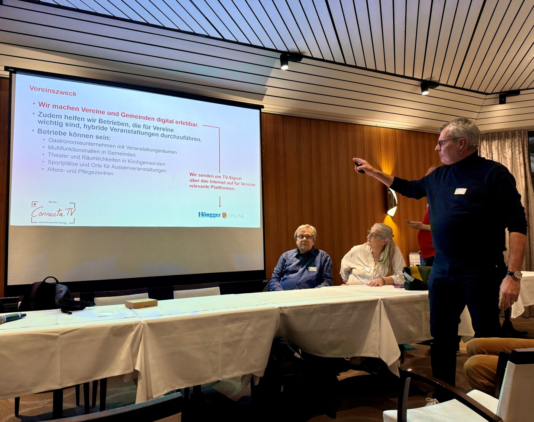 Der Hauptfokus des Abends lag auf der digitalen Vernetzung im Quartier, vorgestellt von Christian Mossner vom neu gegründeten Verein Connecta.TV. Dessen Ziel ist es, professionell produzierte Videos aus und für Höngg zu erstellen und zu verbreiten. Dafür wurde ein Studio mit professionellem Equipment in der «Mühlehalde» eingerichtet.