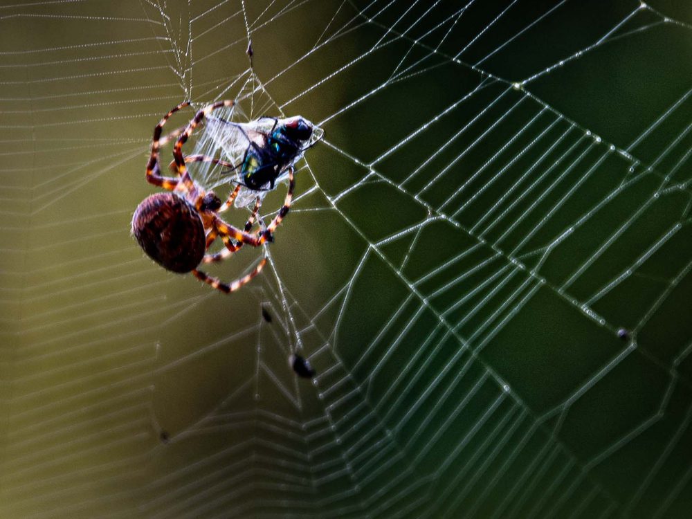 Spinnen produzieren ihr Baumaterial vor Ort und erstellen daraus ein architektonisches Wunderwerk. Die Netze der Radnetzspinnen fallen jetzt im herbstlichen Morgentau besonders auf und mit etwas Glück entdeckt man darin eine Kreuzspinne.