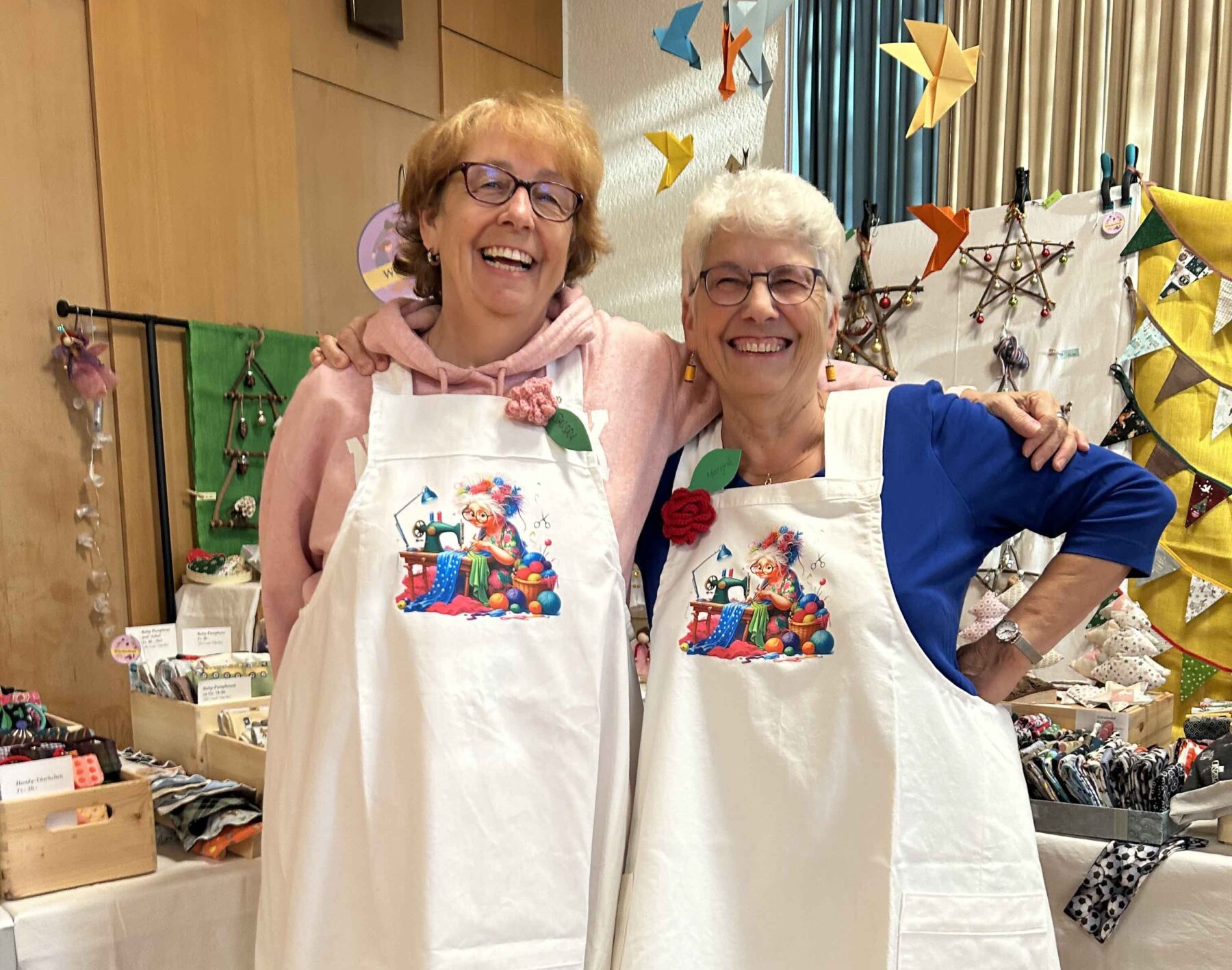 Auch die Frauengruppe rund um Susanna Gehrig-Meili weiss zu begeistern. Mützen, Schals, farbenfrohe Amedisli, dazu gehäkelte Duftkissen, Elfensujets oder filigrane Häkelblumen – um nur einiges zu nennen – stehen zum Verkauf. Auf der Bühne präsentiert derweil Domenica Frehner ihr Projekt «Handglismets», bei dem besonders Socken in allen Grössen und Variationen im Mittelpunkt stehen.