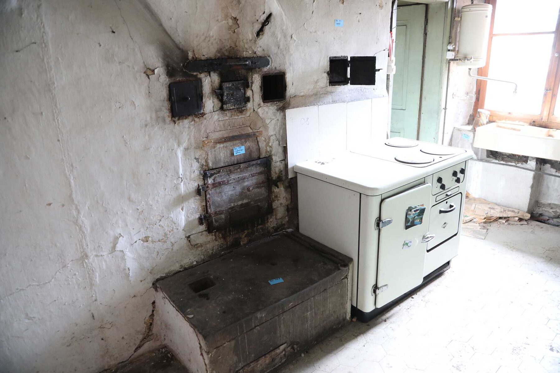 Befeuert wurde der Ofen durch die Küche, welche sich heute noch im dahinterliegenden Raum befindet. Hier findet sich eine Feuerwand mit Einfeuerungs- und Russöffnungen. Höchstwahrscheinlich war auch die ehemalige Kochstelle in der Küche mit dem Ofen, respektive dessen rechteckigen Anbau, der Ofenkunst, verbunden.